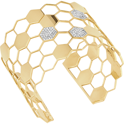 Ispirato al lavoro prezioso delle api, questo maestoso braccialetto manchette è formato da 5 file di celle in oro. Venti celle piene esaltano il gioiello e 3 celle impreziosite da 111 diamanti conferiscono all’insieme un tocco di luminosità e d’eleganza. Il braccialetto manchette Rivelazione è un inno alla natura e alla bellezza senza tempo dell'oro e dei diamanti.
