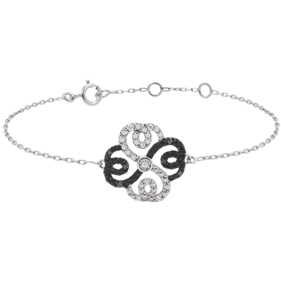 Un sublime braccialetto in Oro bianco incastonato di diamanti bianchi e neri, montato su una catenina. Il gioiello è disponibile in 18 cm, 17cm e 16cm. Applicazione di 14.5 mm di lunghezza e 14.5 mm di altezza.