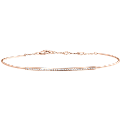 Un delicato bracciale rigido in oro rosa impreziosito da 40 diamanti, perfetto per illuminare il polso. Braccialetto con chiusura a catena per una maggiore praticità.