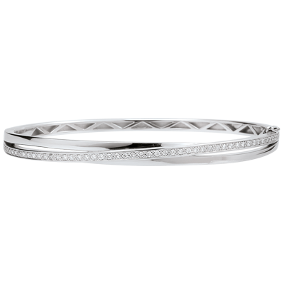L'unione equilibrata di tre anelli, esaltata da un pavé di diamanti su oro bianco, per questo prezioso e sofisticato bracciale rigido.