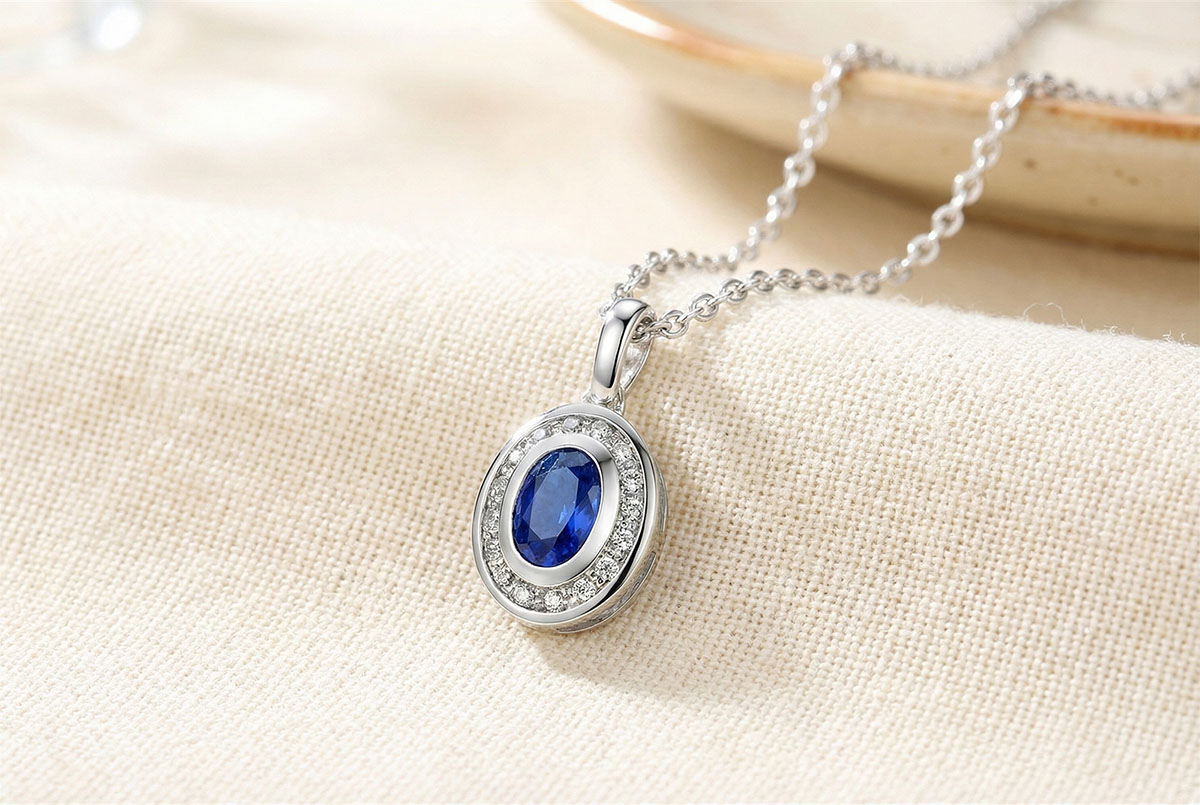 Ciondolo impreziosito da uno zaffiro circondato da un pavé di diamanti. Un essenziale della gioielleria, classico e senza tempo.