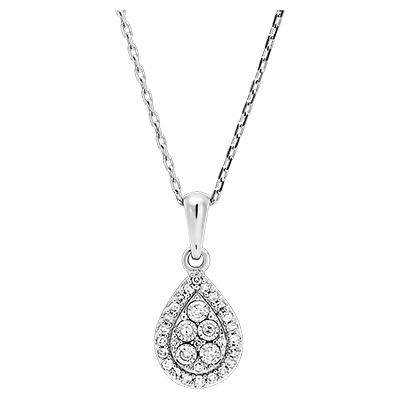 Il bagliore di un ciondolo con pavé di diamanti a forma di pera, coronato da un alone di diamanti. Un ciondolo in oro bianco fine e delicato, permeato di eleganza senza tempo.