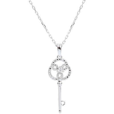 Ciondolo a forma di chiave in oro bianco, le cui linee curve sinuose incastonate di fiori d'oro vegliano su un diamante unico ed eterno.