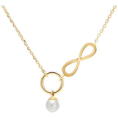 Una collana in oro giallo impreziosita da un anello, una perla e un ciondolo a forma di infinito, per un modello pieno di movimento e leggerezza.