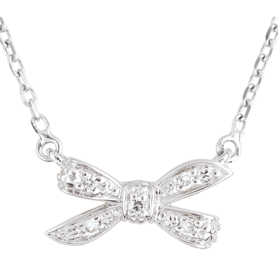 Un prezioso fiocco in Oro e diamanti abbinato a una catena d'Oro bianco.