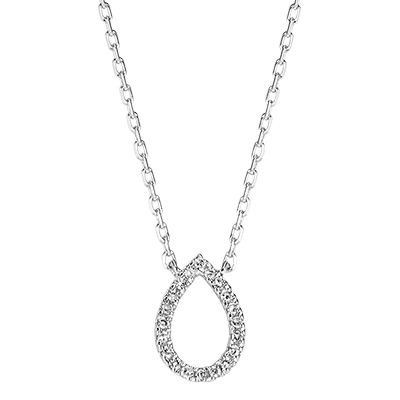 Una goccia impreziosita da un delicato pavé di diamanti e montata su una collana in oro bianco, per un modello puro, vicino alle forme naturali e alle emozioni.