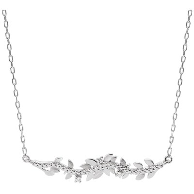 Un'alternanza di foglie brillanti in Oro bianco e di foglie in Oro spazzolato a mano per una collana romantica impreziosita da 7 diamanti.