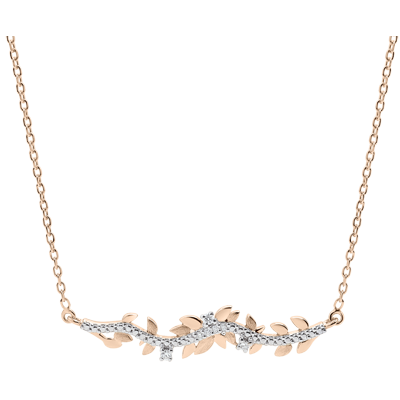 Un'alternanza di foglie brillanti d'oro rosa e di foglie d'oro spazzolato a mano per una collana romantica incastonata di 7 diamanti.