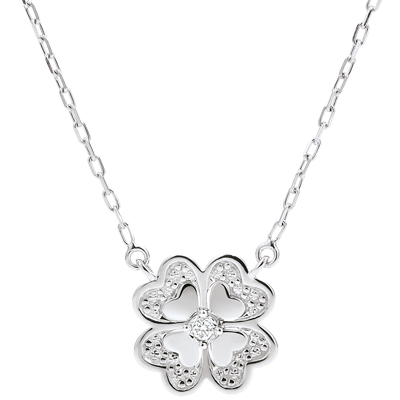 Una collana moderna con un quadrifoglio scintillante in oro bianco, piccoli motivi in oro sulle foglie e un diamante centrale.
