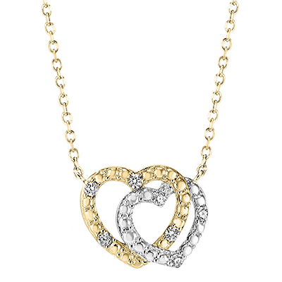 Questa collana, duo di cuori in oro bianco e oro giallo diamantati impreziositi da diamanti, ispira tenerezza e complicità.