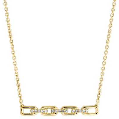 Quattro ampie maglie cubane con diamanti incastonati, a contrasto con una delicata catenina per una collana in oro giallo classico rivisitata. Con catenina di lunghezzza 45cm e anellino di regolazione a 42cm.
