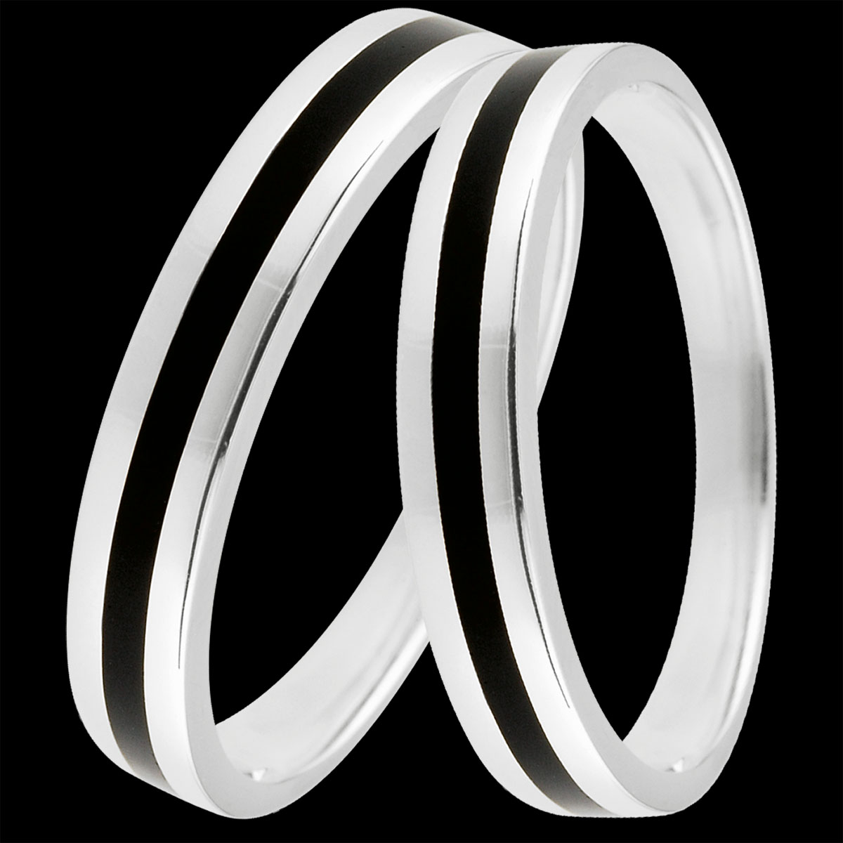Un’elegante coppia di fedi in oro bianco attraversate da una fascia in lacca nera. La scelta perfetta per chi desidera raffinatezza senza tempo e originalità.