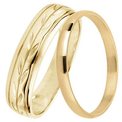 Un'elegante coppia di fedi per lei & lui. Una fede dalla linea tonda, lucida, di 2 mm per lei; una fede più ampia in oro giallo inciso con fogliame eterno per lui.