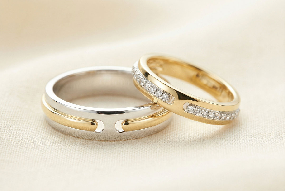 Un'elegante coppia di fedi per lei & lui. Due file di diamanti, simbolo di una promessa eterna, si uniscono in un anello d'oro giallo per lei; per lui, due linee d’oro giallo si intrecciano come promessa d’eternità su un anello in oro bianco.