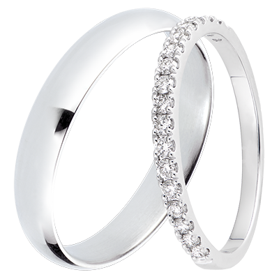 Un elegante duo di fedi per lei & lui. Per lei, una fede semi pavé con 18 diamanti per un totale di 0,26 carati. Per lui, un anello in oro bianco lucido da 4 mm.