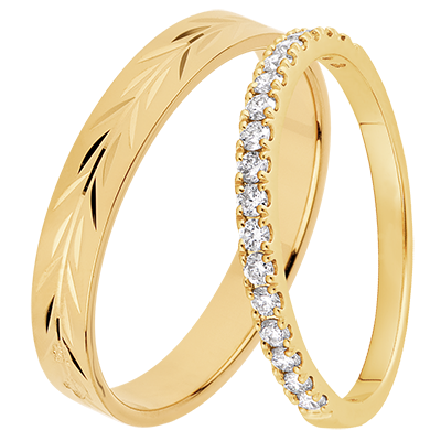 Un’elegante coppia di fedi nuziali per lei & lui. Una fede semi-pavé con 18 diamanti da 0,26 carati per lei, e una fede in oro giallo incisa con motivo vegetale per lui.