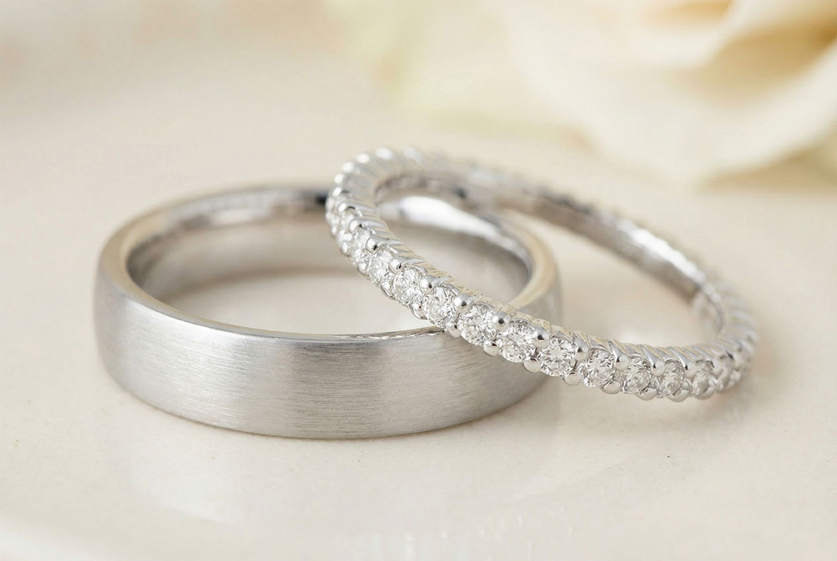 Una coppia di fedi elegante per lei e lui. Per lei: un giro completo con 38 diamanti da 0,57 carati totali, montati a griffes. Per lui: una fede nuziale in oro bianco satinato, larga 4 mm. Raffinatezza per un amore senza tempo.