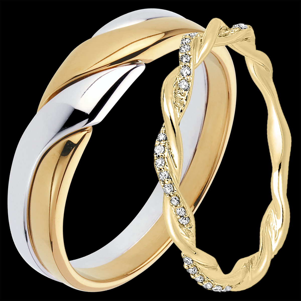 Un’elegante coppia di fedi nuziali per lei e lui. Per lei: due fili intrecciati di oro giallo, uno tempestato di diamanti. Per lui: un anello in oro giallo intrecciato con uno in oro bianco.