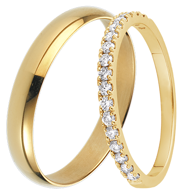Un raffinato duo di fedi nuziali per lei e lui. Per lei, un anello semi pavé con 18 diamanti (totale 0,26ct), per lui una fede in oro giallo lucido da 3,5mm. Eleganza e amore senza tempo.