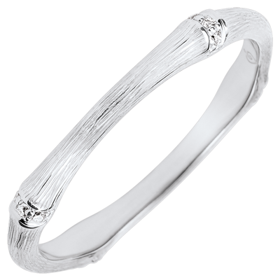 Un ramo di bambù solido e flessibile si trasforma in un anello d'oro bianco spazzolato incastonato di diamanti dal fascino eterno. La finitura opaca. lavorata a mano gli conferisce un aspetto naturale dal sorprendente realismo.