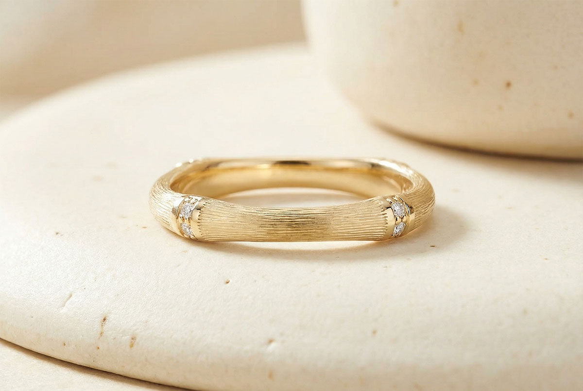 Un ramo di bambù solido e flessibile si trasforma in un anello d'oro giallo spazzolato incastonato di diamanti dal fascino eterno. La finitura opaca lavorata a mano. gli conferisce un aspetto naturale dal sorprendente realismo.
