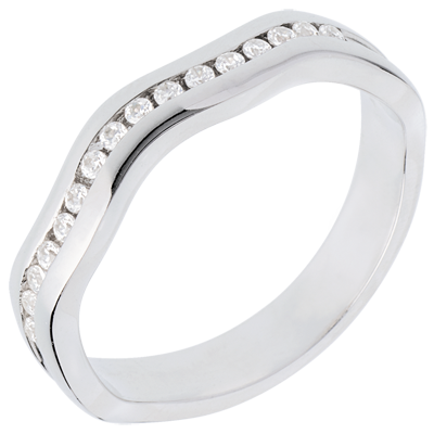 Un originale anello ondulato con 16 diamanti incastonati a binario, per una fede piena d'ebbrezza e d'avventura.