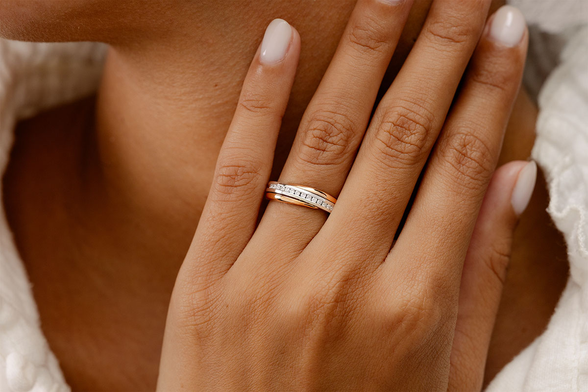 Una fede in Oro rosa abbracciata da un anello in Oro bianco semi pavé, per un gioiello armonioso ed elegante.