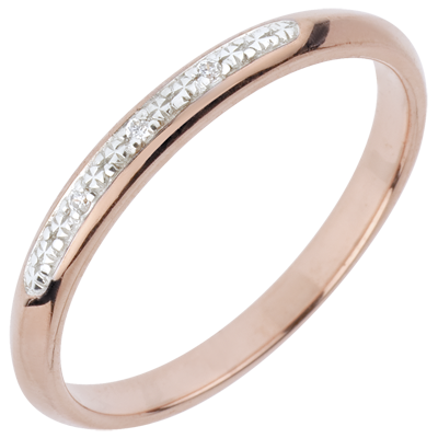Una fede romantica in Oro rosa con pavé di diamanti taglio brillante su una base d'Oro bianco.