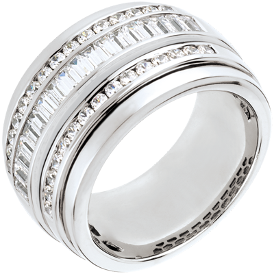 Una fila di 18 diamanti baguette circondata da due fila di brillanti per un anello di carattere e di grande eleganza.