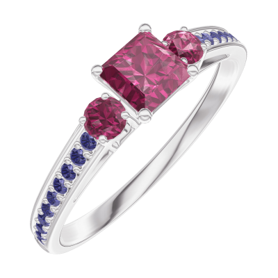 « L'ATELIER » N. 160755Anello Oro bianco 18 carati - Rubino Principessa 0.3 Carati - Pietre laterali Rubino - Incastonatura Zaffiro blu