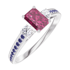 Anello Oro bianco 9 carati - Rubino Rettangolo 0.3 Carati - Pietre laterali Diamante - Incastonatura Zaffiro blu
