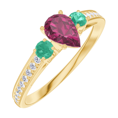 « L'ATELIER » Nº161085Anello Oro giallo 18 carati - Rubino Goccia 0.3 Carati - Pietre laterali Smeraldo - Incastonatura Diamante