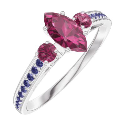 « L'ATELIER » N. 161155Anello Oro bianco 18 carati - Rubino Marchesa 0.3 Carati - Pietre laterali Rubino - Incastonatura Zaffiro blu