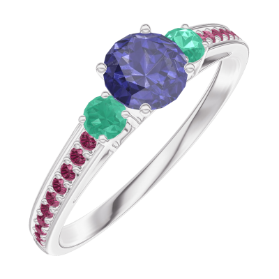 « L'ATELIER » N. 161291Anello Oro bianco 18 carati - Zaffiro blu Rotonda 0.3 Carati - Pietre laterali Smeraldo - Incastonatura Rubino 4.5 (36)