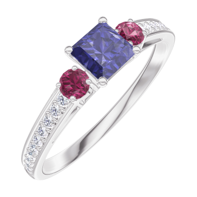 « L'ATELIER » N. 161348Anello Oro bianco 9 carati - Zaffiro blu Principessa 0.3 Carati - Pietre laterali Rubino - Incastonatura Diamante