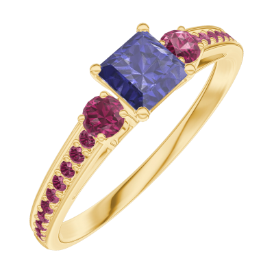 « L'ATELIER » N. 161350Anello Oro giallo 9 carati - Zaffiro blu Principessa 0.3 Carati - Pietre laterali Rubino - Incastonatura Rubino