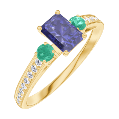 « L'ATELIER » N. 161486Anello Oro giallo 9 carati - Zaffiro blu Rettangolo 0.3 Carati - Pietre laterali Smeraldo - Incastonatura Diamante
