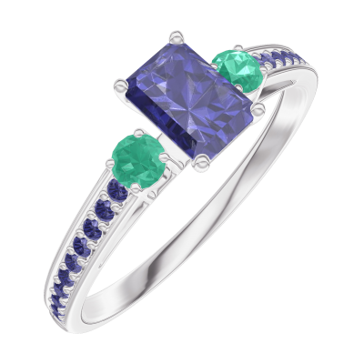« L'ATELIER » N. 161496Anello Oro bianco 9 carati - Zaffiro blu Rettangolo 0.3 Carati - Pietre laterali Smeraldo - Incastonatura Zaffiro blu