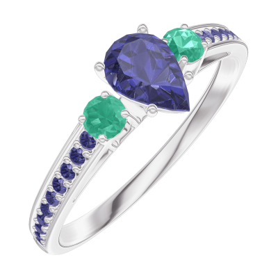 « L'ATELIER » N. 161695Anello Oro bianco 18 carati - Zaffiro blu Goccia 0.3 Carati - Pietre laterali Smeraldo - Incastonatura Zaffiro blu