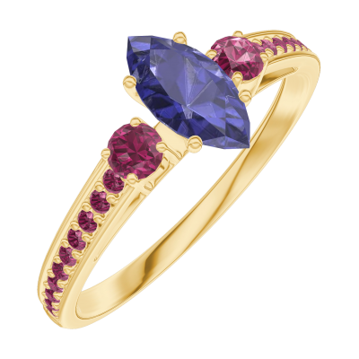 « L'ATELIER » N. 161750Anello Oro giallo 9 carati - Zaffiro blu Marchesa 0.3 Carati - Pietre laterali Rubino - Incastonatura Rubino