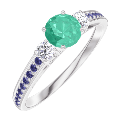 « L'ATELIER » N. 161836Anello Oro bianco 9 carati - Smeraldo Rotonda 0.3 Carati - Pietre laterali Diamante - Incastonatura Zaffiro blu 4.5