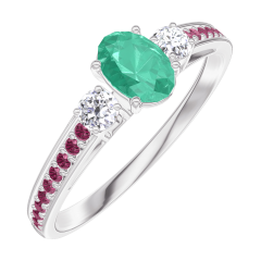 Anello Oro bianco 9 carati - Smeraldo Ovale 0.3 Carati - Pietre laterali Diamante - Incastonatura Rubino