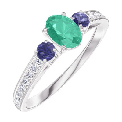 « L'ATELIER » Nº162168Anello Oro bianco 9 carati - Smeraldo Ovale 0.3 Carati - Pietre laterali Zaffiro blu - Incastonatura Diamante 5