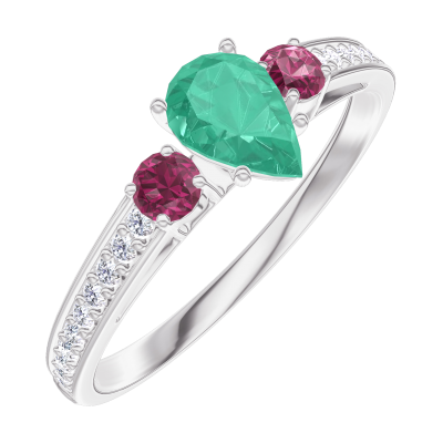 « L'ATELIER » Nº162248Anello Oro bianco 9 carati - Smeraldo Goccia 0.3 Carati - Pietre laterali Rubino - Incastonatura Diamante