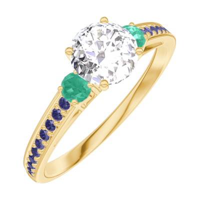 Anello Oro giallo 18 carati - Diamante Rotonda 0.5 Carati - Pietre laterali Smeraldo - Incastonatura Zaffiro blu