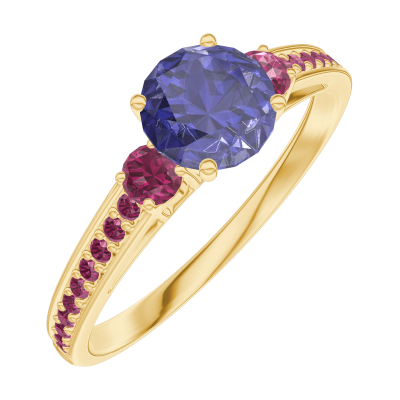 « L'ATELIER » N. 163650Anello Oro giallo 9 carati - Zaffiro blu Rotonda 0.5 Carati - Pietre laterali Rubino - Incastonatura Rubino 4.5