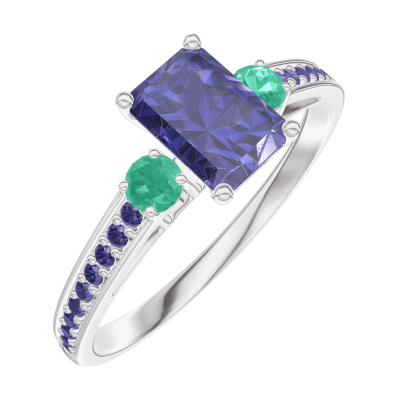« L'ATELIER » N. 163895Anello Oro bianco 18 carati - Zaffiro blu Rettangolo 0.5 Carati - Pietre laterali Smeraldo - Incastonatura Zaffiro blu
