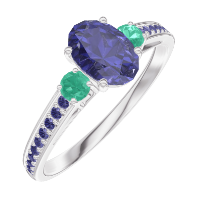 « L'ATELIER » Nº163996Anello Oro bianco 9 carati - Zaffiro blu Ovale 0.5 Carati - Pietre laterali Smeraldo - Incastonatura Zaffiro blu