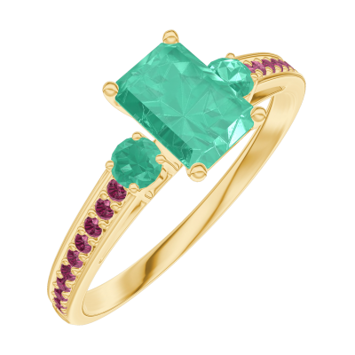 « L'ATELIER » N. 164490Anello Oro giallo 9 carati - Smeraldo Rettangolo 0.5 Carati - Pietre laterali Smeraldo - Incastonatura Rubino