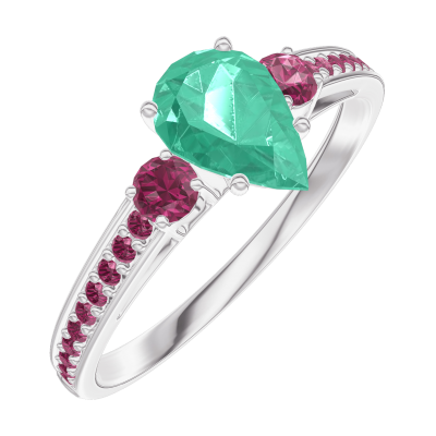 « L'ATELIER » N. 164652Anello Oro bianco 9 carati - Smeraldo Goccia 0.5 Carati - Pietre laterali Rubino - Incastonatura Rubino